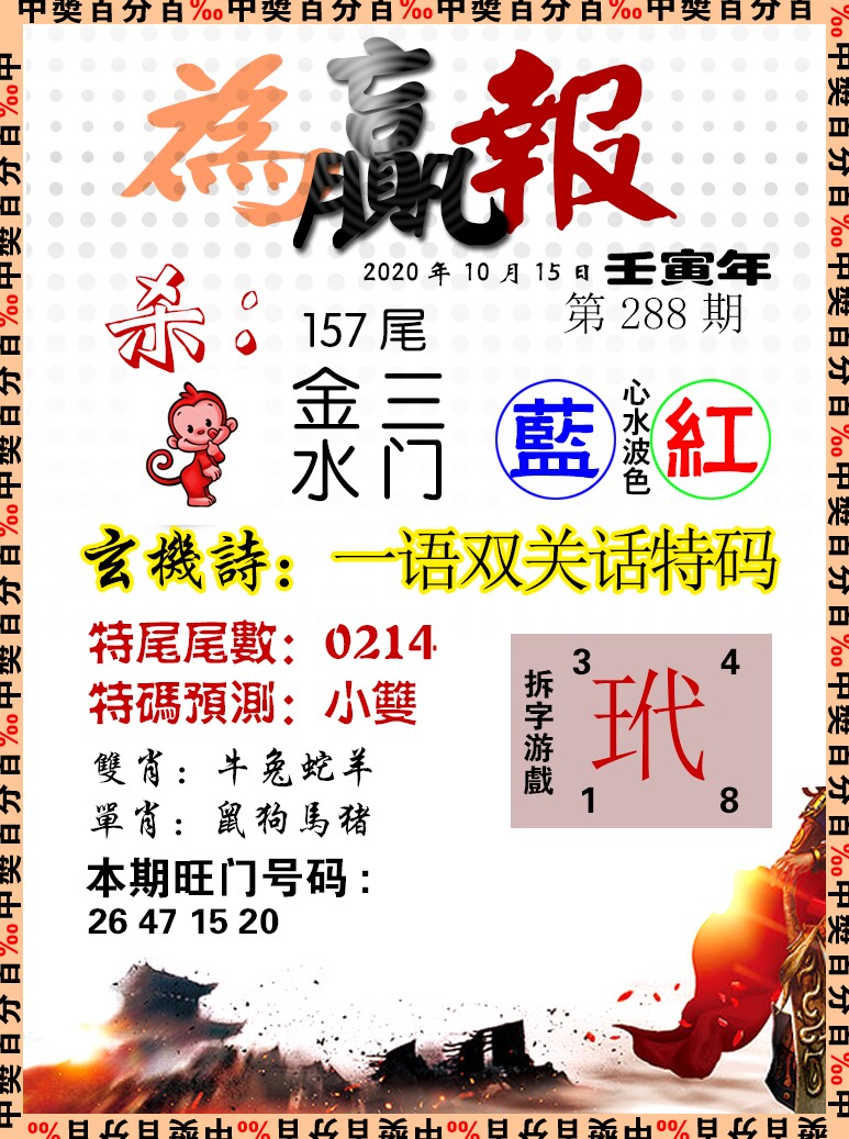 288期:规律四肖 【鼠虎蛇猴】开:?00 |